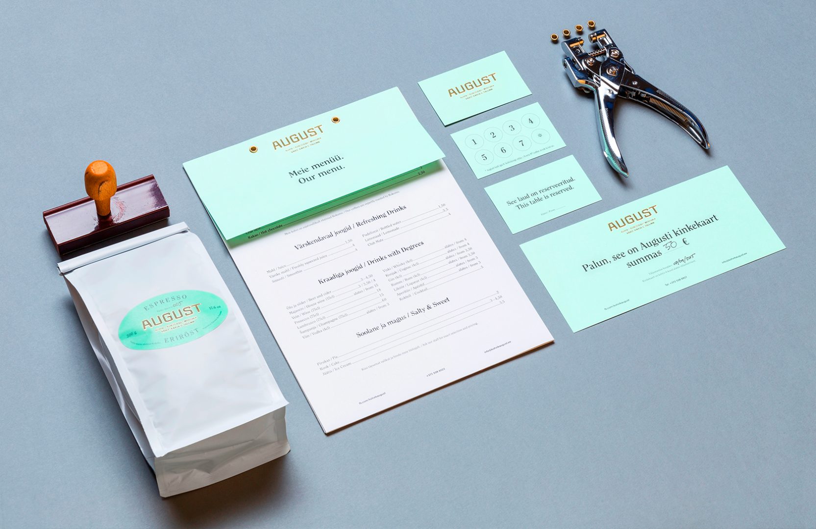 In 1907 August Abram-Aarma started his textile manufacture on the corner of Väike-Karja and Müürivahe street. In 2015 August – a café and cocktail bar with good music – was opened on the exact same spot. Colourful interior design centers around the light green and brass bar and same tones are used throughout the stationery. Morris Fuller Benton’s Clearface (also from 1907) gives the identity a historically correct yet contemporary feel.
